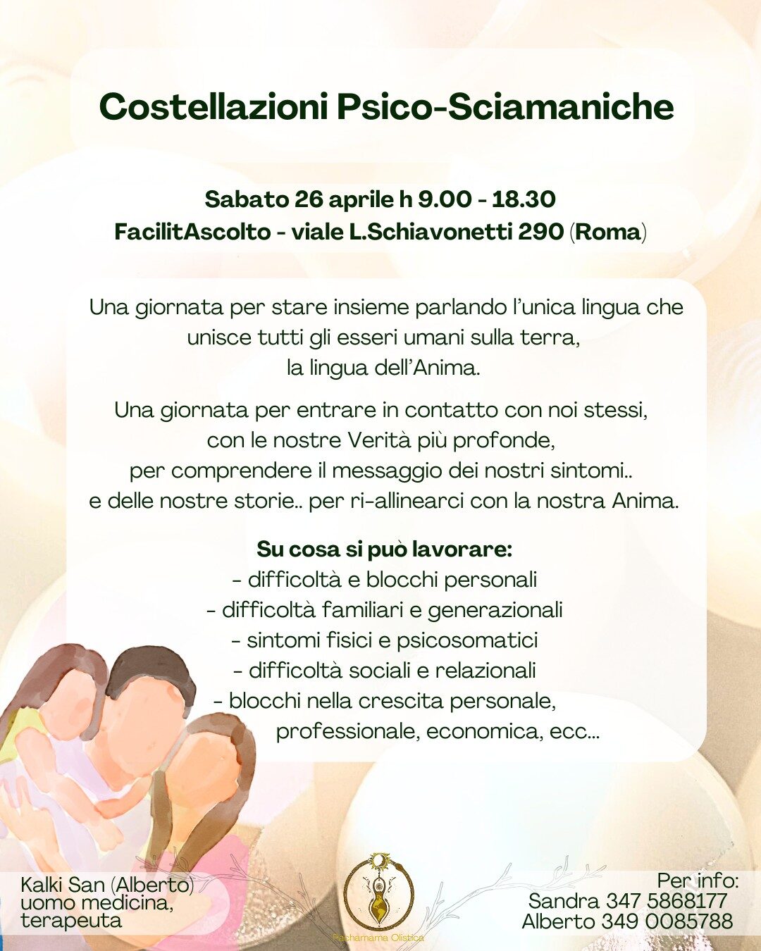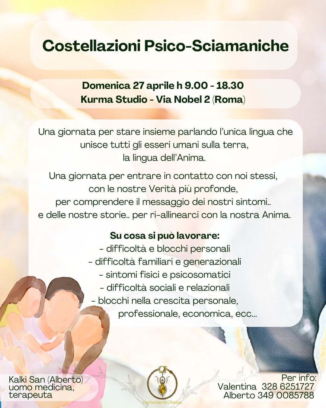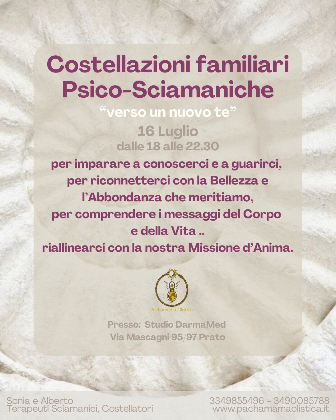 Nelle Costellazioni Psico-Sciamaniche, ci immergiamo in un viaggio dell’anima attraverso la rappresentazione degli intricati intrecci della nostra psiche e della storia genealogica. Attingiamo alle profonde memorie del campo morfogenetico, conosciuto anche come lo spazio dell’Akasha, dove le invisibili Forze dell’esistenza conservano le memorie dei nostri destini, senza limiti di tempo e spazio. In questo spazio senza confini, sveliamo verità nascoste, liberi dai vincoli della morale e dell’etica, permettendo alla nostra vita di riappropriarsi della Libertà che le appartiene per Natura; libertà che i condizionamenti familiari, culturali e temporali hanno limitato, portando malessere, disarmonia e malattia nella nostra Vita. Un viaggio di scoperta e di guarigione che ha come fine l’illuminare tutte le sfere che compongono quel misterioso e divino essere che ognuno di noi “è”. È possibile partecipare portando il proprio lavoro personale oppure anche soltanto come spettatori per poter conoscere questo lavoro.