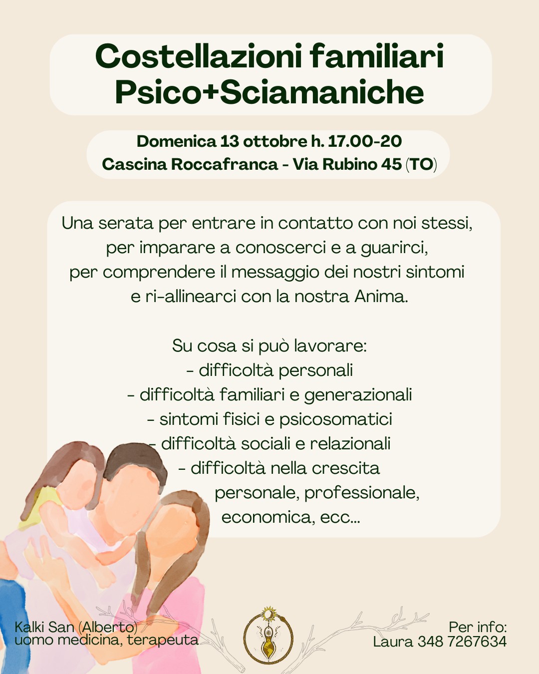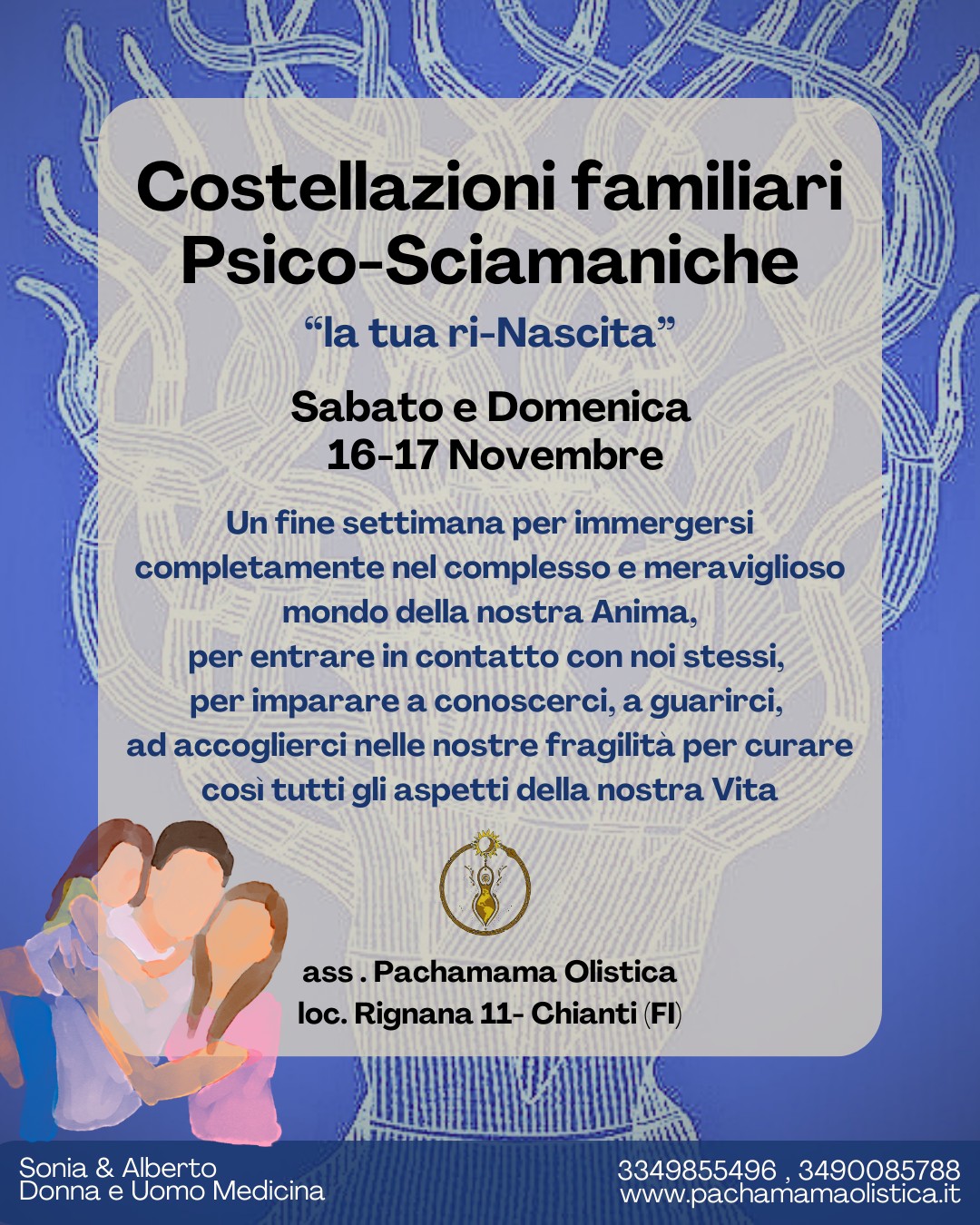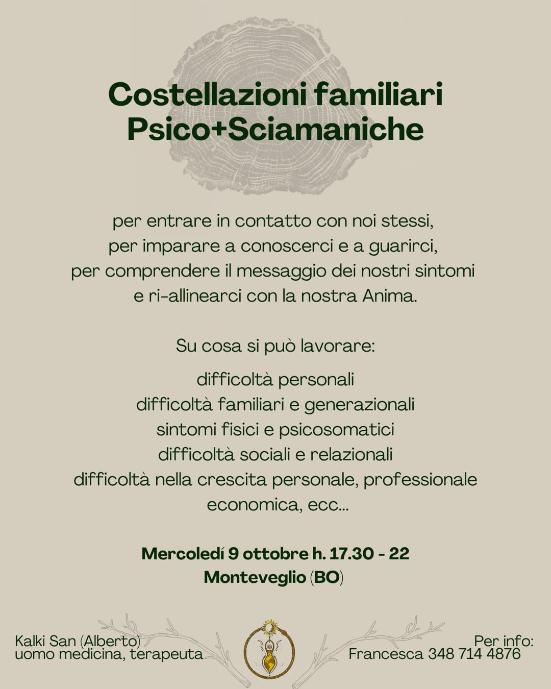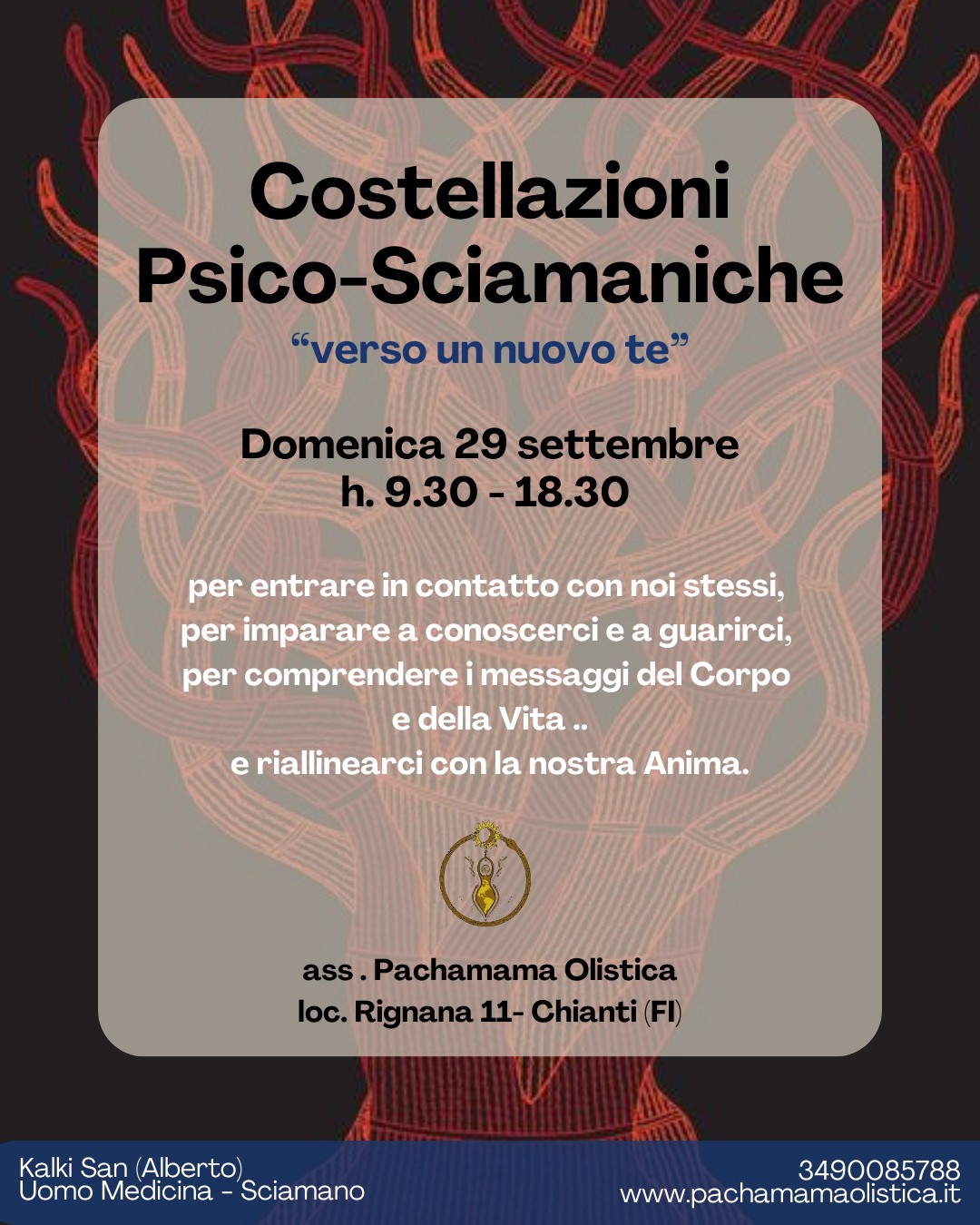 Costellazioni Psico-Sciamaniche a Monteveglio, Bologna Nelle Costellazioni Psico-Sciamaniche ci immergiamo in un viaggio dell’anima attraverso la rappresentazione degli intricati intrecci della nostra psiche e delle forze invisibili che permeano il nostro essere. Come antichi custodi del mistero che è la Vita, attingiamo alle profonde memorie del campo morfogenetico, conosciuto anche come lo spazio dell’Akasha, dove le invisibili Forze dell’esistenza conservano le memorie dei nostri destini, senza limiti di tempo e spazio. In questo spazio senza confini, sveliamo verità nascoste, liberi dai vincoli della morale e dell’etica, permettendo all’anima di riappropriarsi della Libertà che le appartiene per Natura; libertà che i condizionamenti familiari, culturali e temporali hanno limitato, portando malessere, disarmonia e malattia nella nostra Vita. Un viaggio di scoperta e di guarigione che ha come fine l’illuminare tutte le sfere che compongono quel misterioso e divino essere che ognuno di noi “è”. per info e prenotazioni: Francesca 348 714 4876 Costellazioni Psico-Sciamaniche: Viaggi dell'Anima (pachamamaolistica.it)